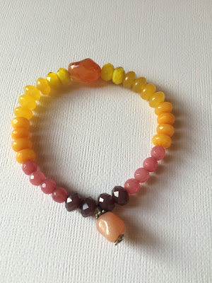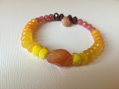 This sun-shiney yellow, pink and purple bracelet is made from glass beads. I put a focal point on both the top and bottom with the chunky bead and the dangling one. It goes with so many of my scarves.