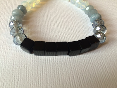 I have had these black square beads for ages and couldn’t think how to use them to showcase them. The grey beads were the last few I had and the long crystal shape at the bottom is from a pendant. This bracelet is a good to wear with all those black abaya’s and when I can’t find anything else to match. The chunky beads are also very tactile and smooth to wear.