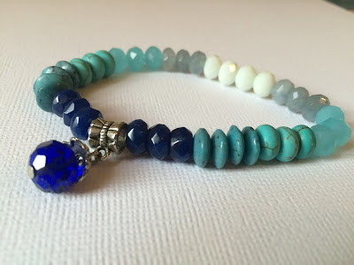 This blue, grey and white bracelet had a mixture of turquoise and glass beads with a dangling blue bead as a focal point.