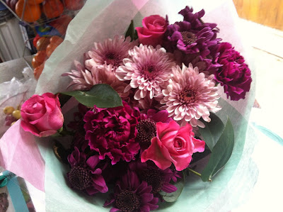 My mum was concerned that I was at home alone and unwell and asked us over for lunch. We headed over with a bunch of flowers and our gifts for her. I picked some bright colourful roses because she loves both roses and bright colours.
