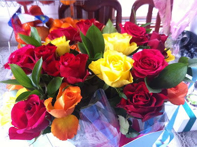My mum was concerned that I was at home alone and unwell and asked us over for lunch. We headed over with a bunch of flowers and our gifts for her. I picked some bright colourful roses because she loves both roses and bright colours.