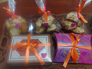 The bags I used for the macaroons were the cellophane bags used to package cards, but a larger size than I usually need. I tied them with rubber bands which I covered with ribbon. The orange and pink ribbon was then used to co-ordinate everything.